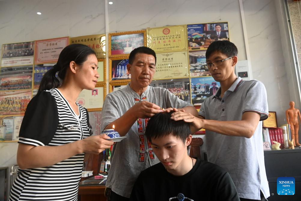 Zhao Zhongmin (2nd L) treats a patient in Tongmu Township of Jinxiu Yao Autonomous County, south China's Guangxi Zhuang Autonomous Region, July 9, 2024.?(Xinhua/Lu Boan)