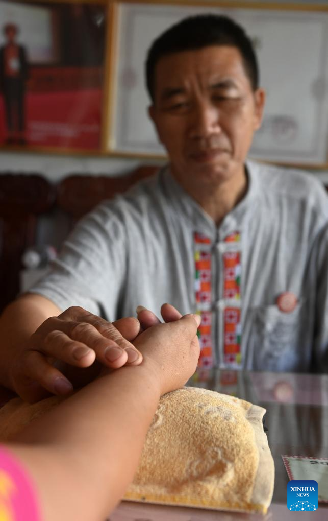 Zhao Zhongmin takes a patient's pulse in Tongmu Township of Jinxiu Yao Autonomous County, south China's Guangxi Zhuang Autonomous Region, July 9, 2024.?(Xinhua/Lu Boan)