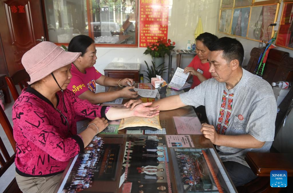 Zhao Zhongmin (1st R) takes a patient's pulse in Tongmu Township of Jinxiu Yao Autonomous County, south China's Guangxi Zhuang Autonomous Region, July 9, 2024. (Xinhua/Lu Boan)