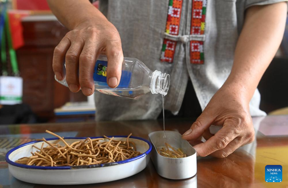 Zhao Zhongmin processes a preparation for a patient in Tongmu Township of Jinxiu Yao Autonomous County, south China's Guangxi Zhuang Autonomous Region, July 9, 2024. (Xinhua/Lu Boan)