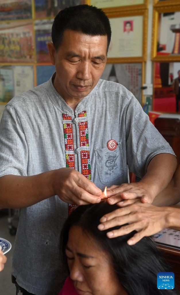Zhao Zhongmin is an inheritor of Jinxiu Yao ethnic herb moxibustion therapy, a regional intangible cultural heritage of Guangxi that helps a recipient enhance body functions by burning herbal preparations at or above acupuncture points on the skin.