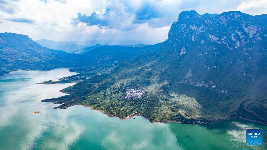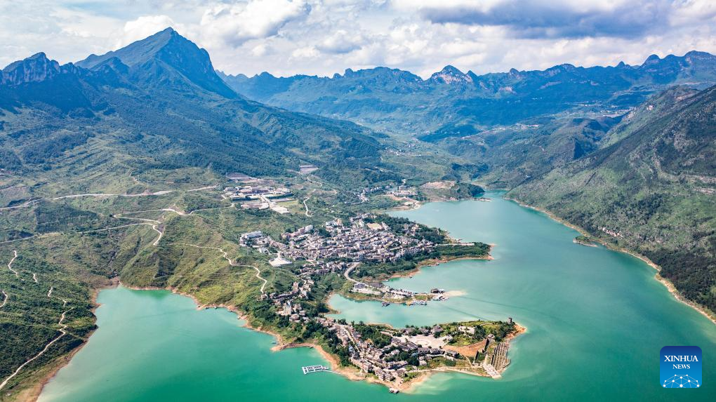This aerial drone photo taken on July 10, 2024 shows a view of the Zangke river scenic area in Liupanshui, southwest China's Guizhou Province. (Xinhua/Tao Liang)