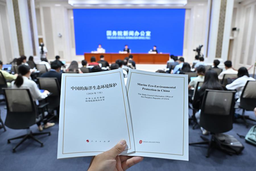 This photo taken on July 11, 2024 shows the Chinese and English copies of the white paper titled "Marine Eco-Environmental Protection in China" in Beijing, capital of China. (Xinhua/Li Xin)