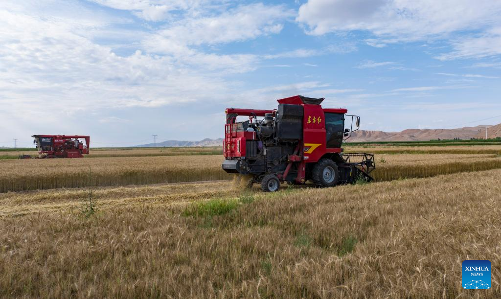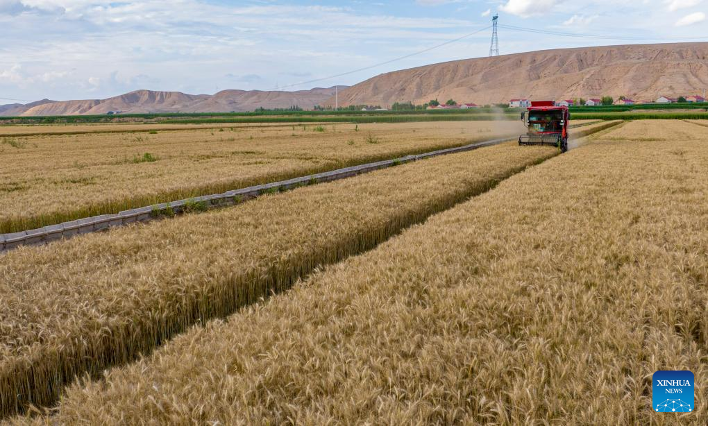 A farmer harvests wheat in a field in Tongxin County of Wuzhong City, northwest China's Ningxia Hui Autonomous Region, July 10, 2024.?(Xinhua/Yang Zhisen)