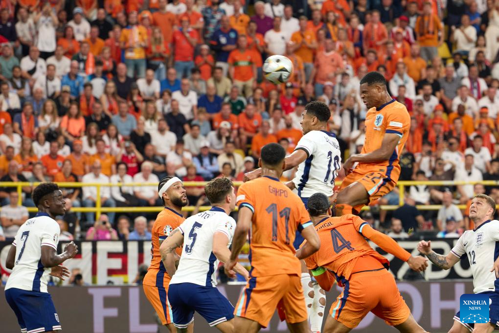 Denzel Dumfries (top, R) of the Netherlands competes for a header during the UEFA Euro 2024 semifinal match between England and the Netherlands in Dortmund, Germany on July 10, 2024. (Xinhua/Meng Dingbo)