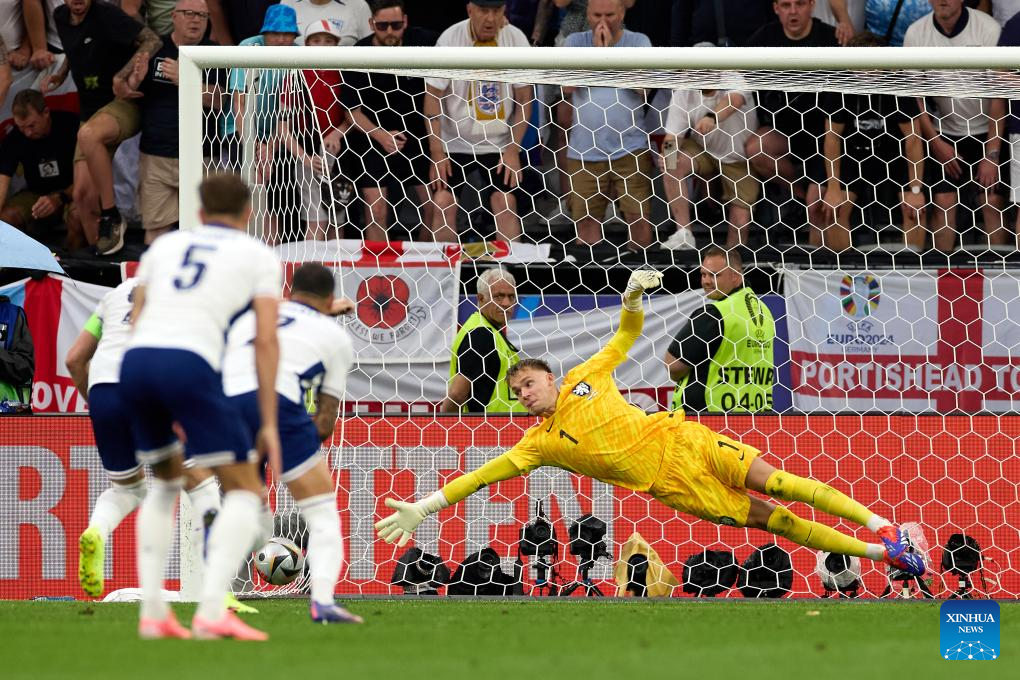 Bart Verbruggen (1st R), goalkeeper of the Netherlands, fails to save the ball during the UEFA Euro 2024 semifinal match between England and the Netherlands in Dortmund, Germany on July 10, 2024. (Xinhua/Meng Dingbo)
