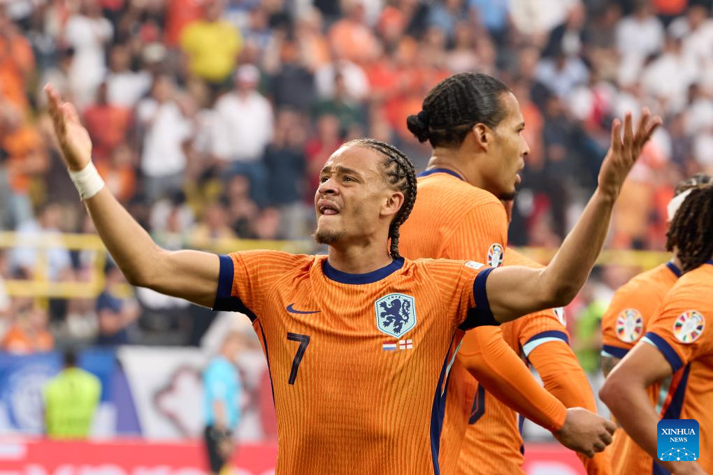 Xavi Simons of the Netherlands celebrates scoring during the UEFA Euro 2024 semifinal match between England and the Netherlands in Dortmund, Germany on July 10, 2024. (Xinhua/Meng Dingbo)