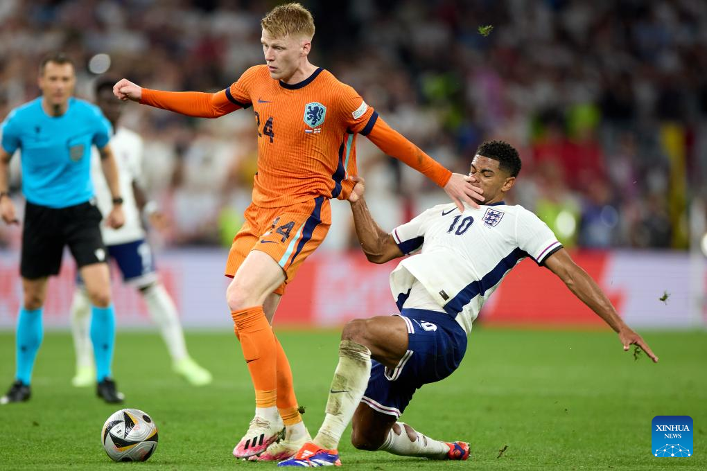 Jude Bellingham (L) of England vies with Jerdy Schouten of the Netherlands during the UEFA Euro 2024 semifinal match between England and the Netherlands in Dortmund, Germany on July 10, 2024. (Xinhua/Meng Dingbo)
