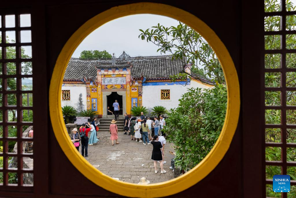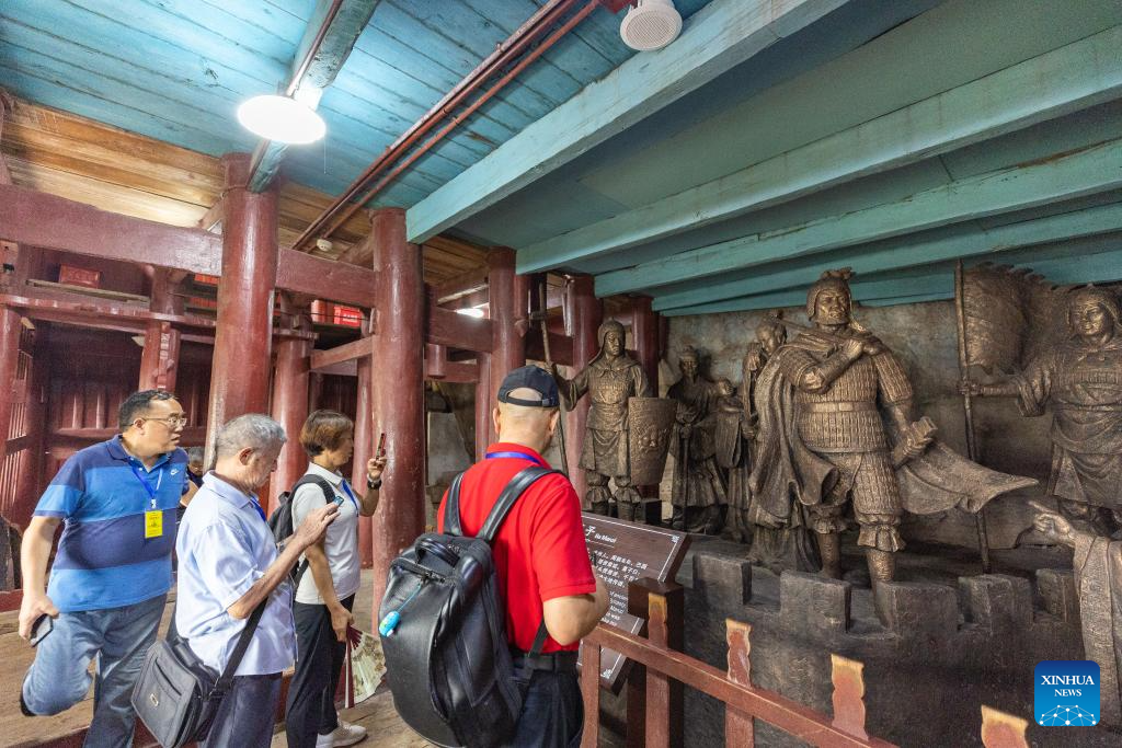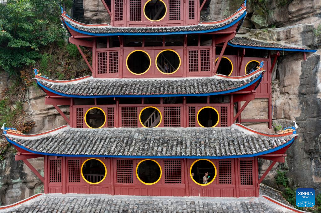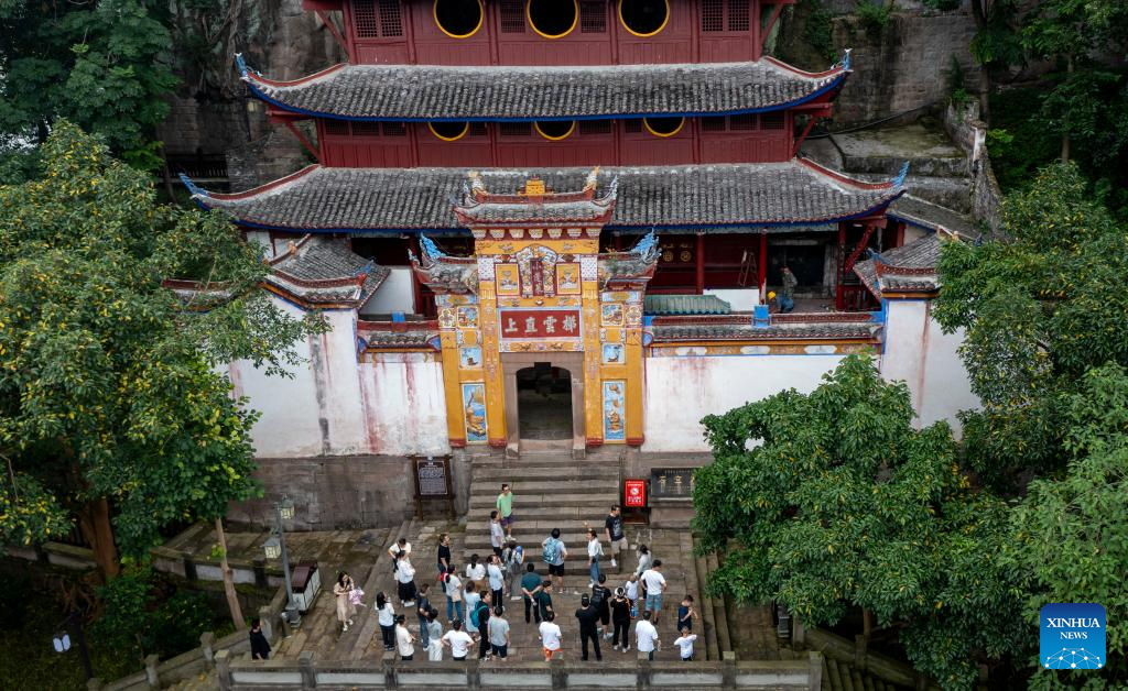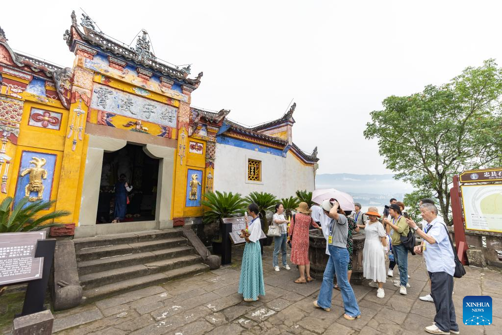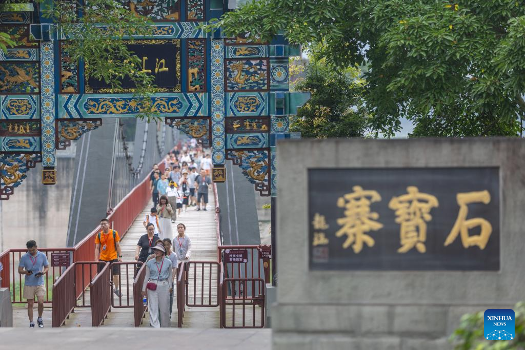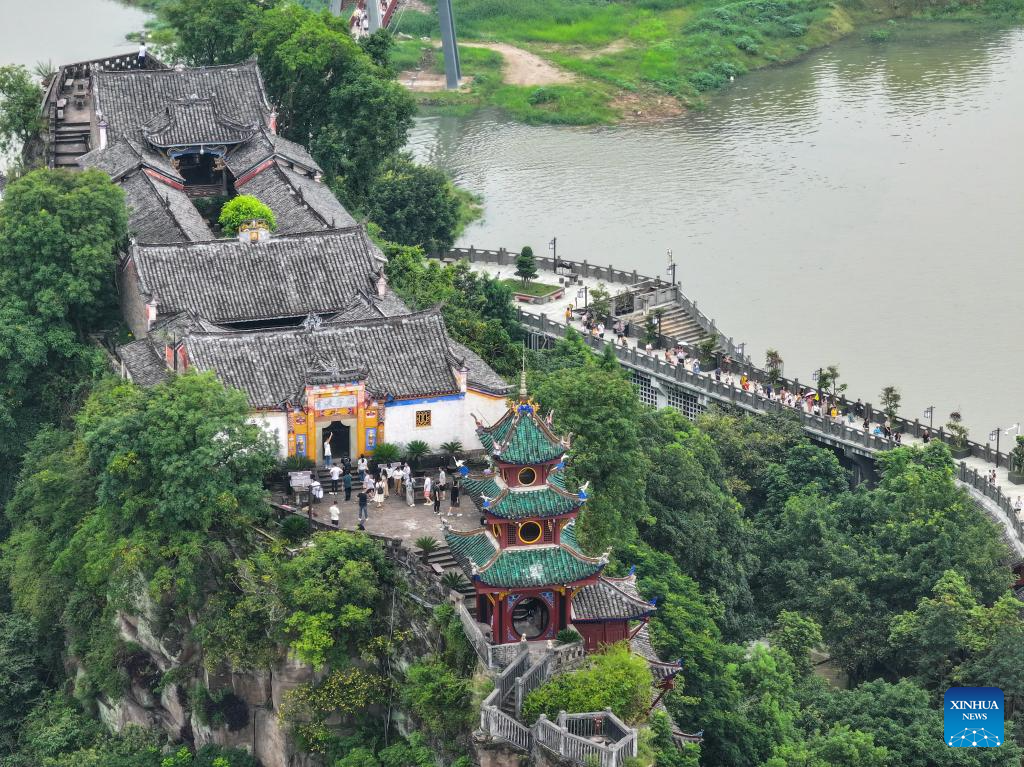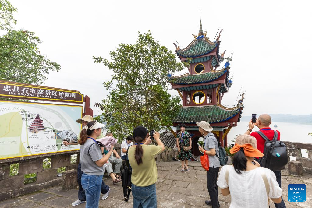 People visit Shibaozhai, a scenic spot in Zhongxian County, southwest China's Chongqing, July 10, 2024. Shibaozhai looks like a heart-shaped bonsai sitting in the middle of Three Gorges section of Yangtze Rier. It is home to a 12-story, 56-meter wooden pagoda that stands on 20 pillars and leans against the cliff. This structure dated back to the Ming Dynasty (1368-1644) serves as a leading tourist attraction of Shibaozhai. (Xinhua/Huang Wei)