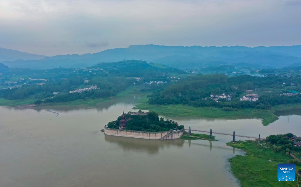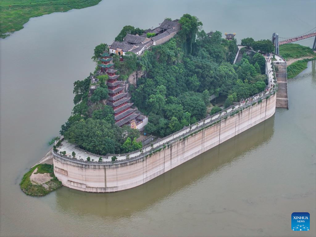 A drone photo taken on July 10, 2024 shows Shibaozhai, a scenic spot in Zhongxian County, southwest China's Chongqing. Shibaozhai looks like a heart-shaped bonsai sitting in the middle of Three Gorges section of Yangtze Rier. It is home to a 12-story, 56-meter wooden pagoda that stands on 20 pillars and leans against the cliff. This structure dated back to the Ming Dynasty (1368-1644) serves as a leading tourist attraction of Shibaozhai. (Xinhua/Huang Wei)