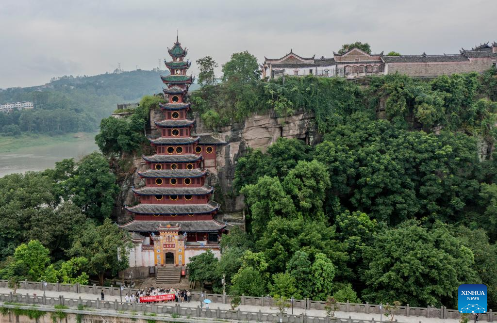 A drone photo taken on July 10, 2024 shows the wooden pagoda in Shibaozhai, a scenic spot in Zhongxian County, southwest China's Chongqing. Shibaozhai looks like a heart-shaped bonsai sitting in the middle of Three Gorges section of Yangtze Rier. It is home to a 12-story, 56-meter wooden pagoda that stands on 20 pillars and leans against the cliff. This structure dated back to the Ming Dynasty (1368-1644) serves as a leading tourist attraction of Shibaozhai. (Xinhua/Liu Chan)