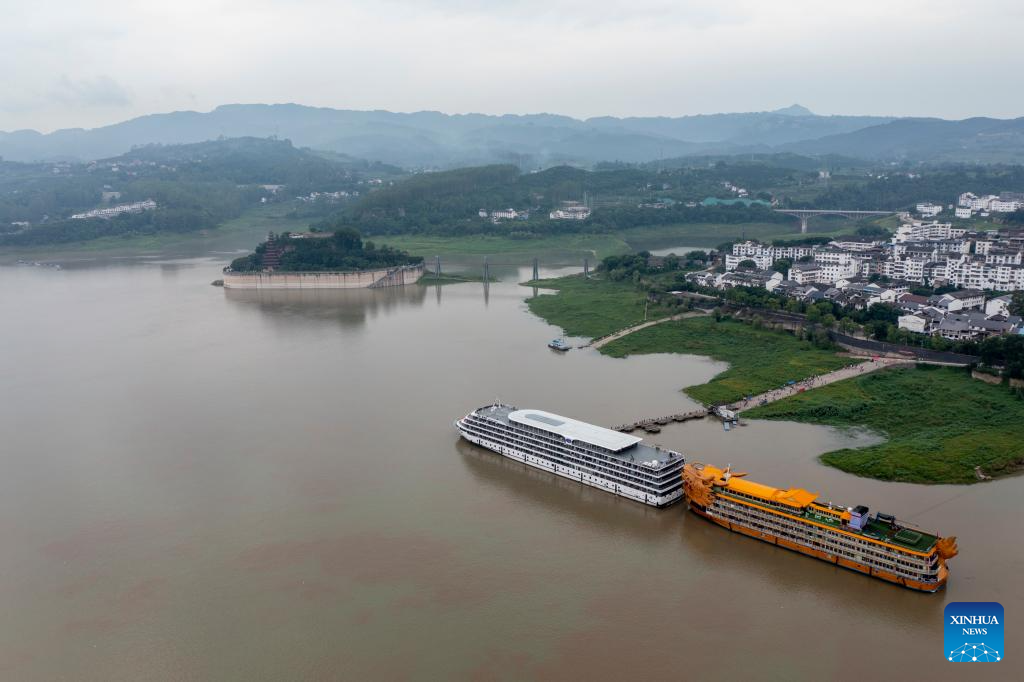 A drone photo taken on July 10, 2024 shows cruise ships docking at Shibaozhai, a scenic spot in Zhongxian County, southwest China's Chongqing. Shibaozhai looks like a heart-shaped bonsai sitting in the middle of Three Gorges section of Yangtze Rier. It is home to a 12-story, 56-meter wooden pagoda that stands on 20 pillars and leans against the cliff. This structure dated back to the Ming Dynasty (1368-1644) serves as a leading tourist attraction of Shibaozhai. (Xinhua/Liu Chan)