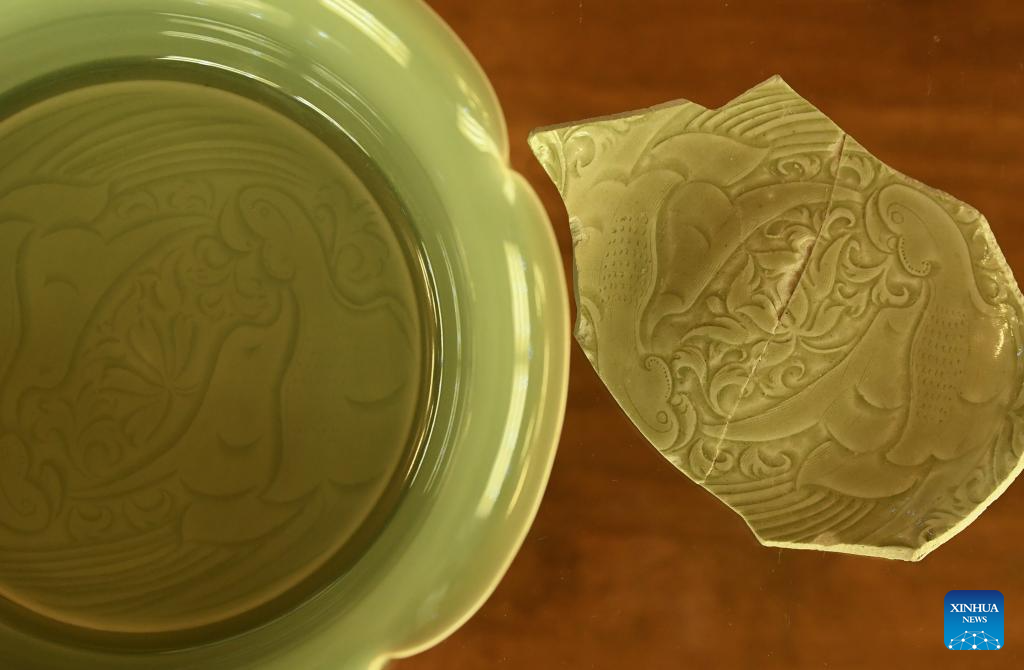 A piece of ancient Shabu-Kiln celadon ware (R) and a celadon ware made by Xie Zhenwei are pictured in Shabu Township, Huangyan of Taizhou, east China's Zhejiang Province, July 11, 2024. (Xinhua/Weng Xinyang)