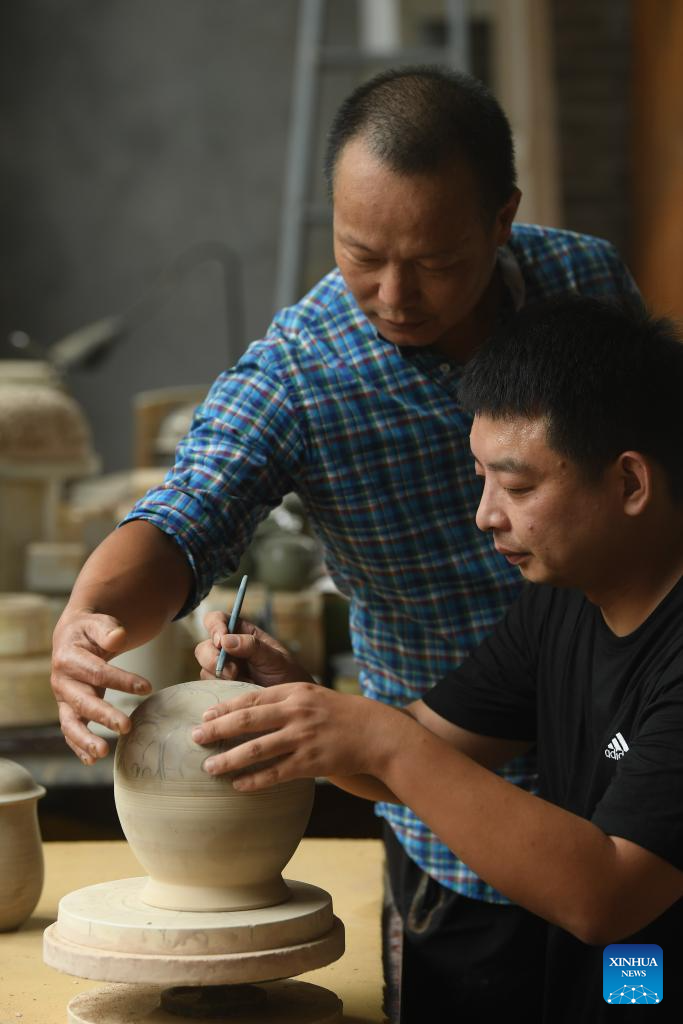 Longquan celadon artisan Chen Junlin (top) instructs as Xie Zhenwei makes a censer in the style of Shabu Kilns in Shabu Township, Huangyan of Taizhou, east China's Zhejiang Province, July 11, 2024. (Xinhua/Weng Xinyang)