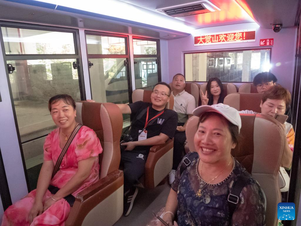 Tourists take an electrical multiple unit (EMU) train at the Dajue Mountain Scenic Area in east China's Jiangxi Province, July 11, 2024. A batch of 30 electrical multiple unit (EMU) trains, part of what is called the "mountain area elevated monorail sightseeing trains and track system," were delivered to the Dajue Mountain Scenic Area in Zixi County, east China's Jiangxi Province on Thursday.