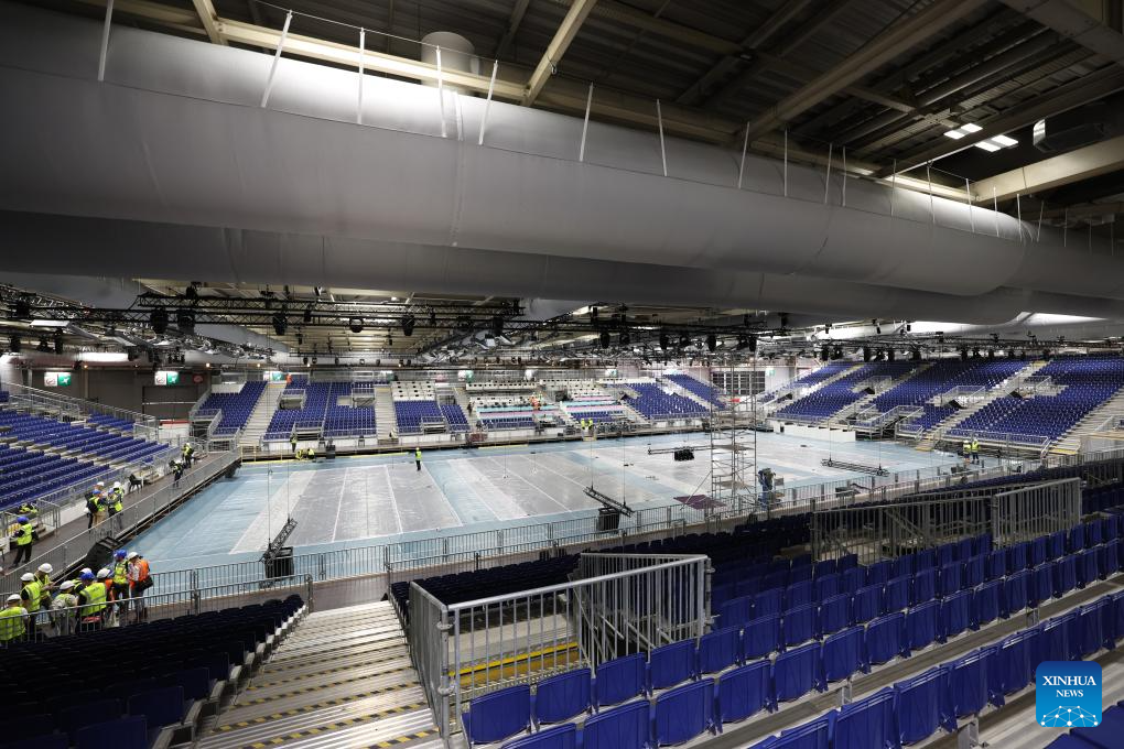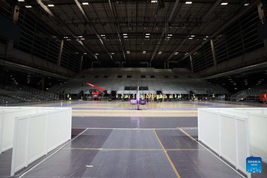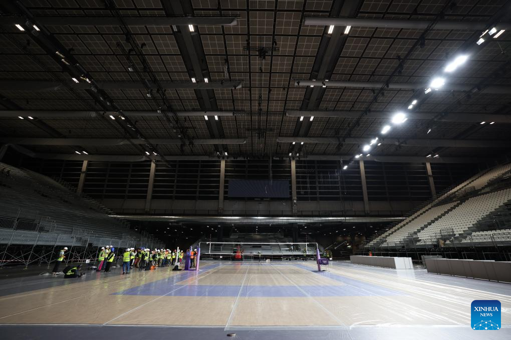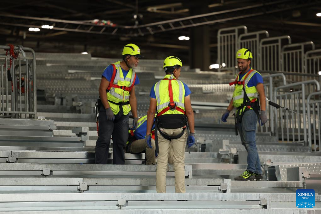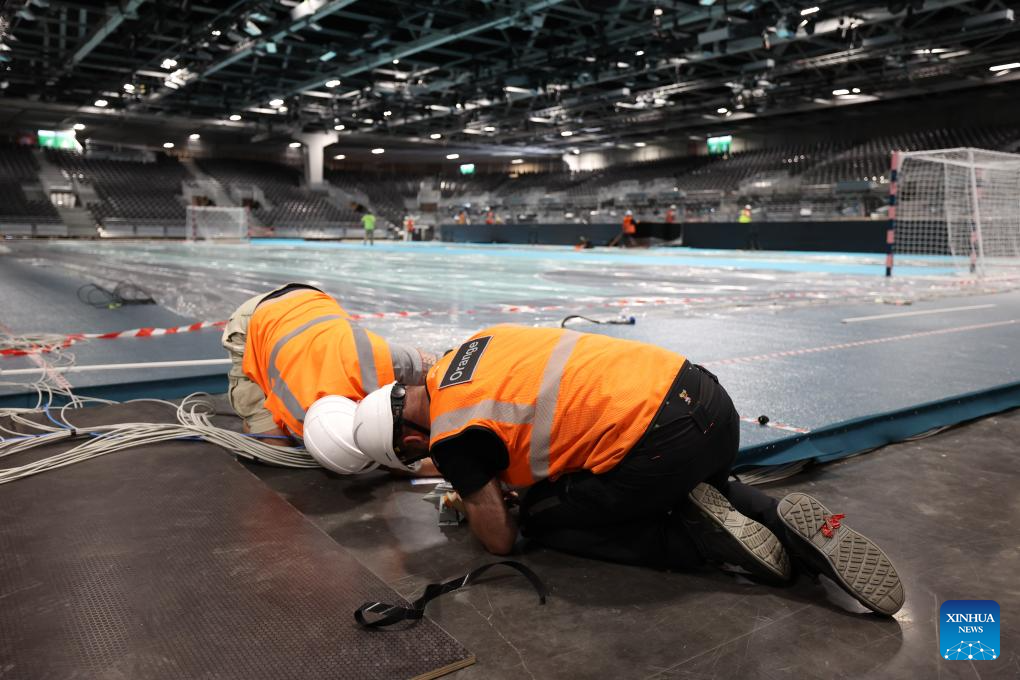 Staffs work in the South Paris Arena in Paris, France, July 11, 2024. The South Paris Arena will host sports events like weightlifting, handball, table tennis and volleyball during the Paris 2024 Olympic Games. (Photo by Julien Mattia/Xinhua)