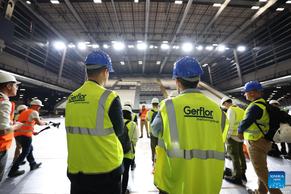 Journalists visit the South Paris Arena, in Paris, France, July 11, 2024. The South Paris Arena will host sports events like weightlifting, handball, table tennis and volleyball during the Paris 2024 Olympic Games. (Photo by Julien Mattia/Xinhua)