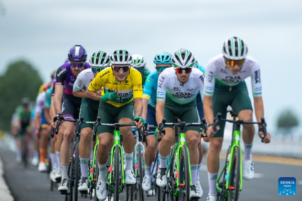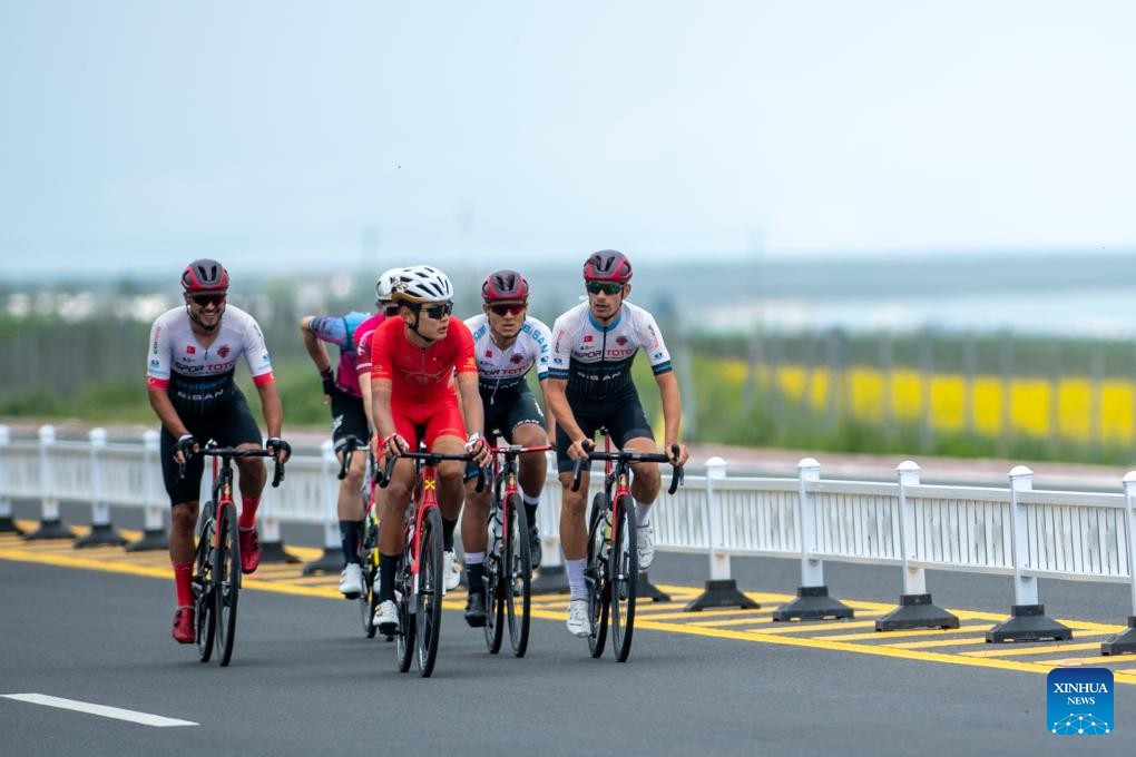 Cyclists compete during the stage 5 of the 23rd Tour of Qinghai Lake cycling race from Gonghe to Xihai, northwest China's Qinghai Province, July 11, 2024. (Photo by Pan Binbin/Xinhua)
