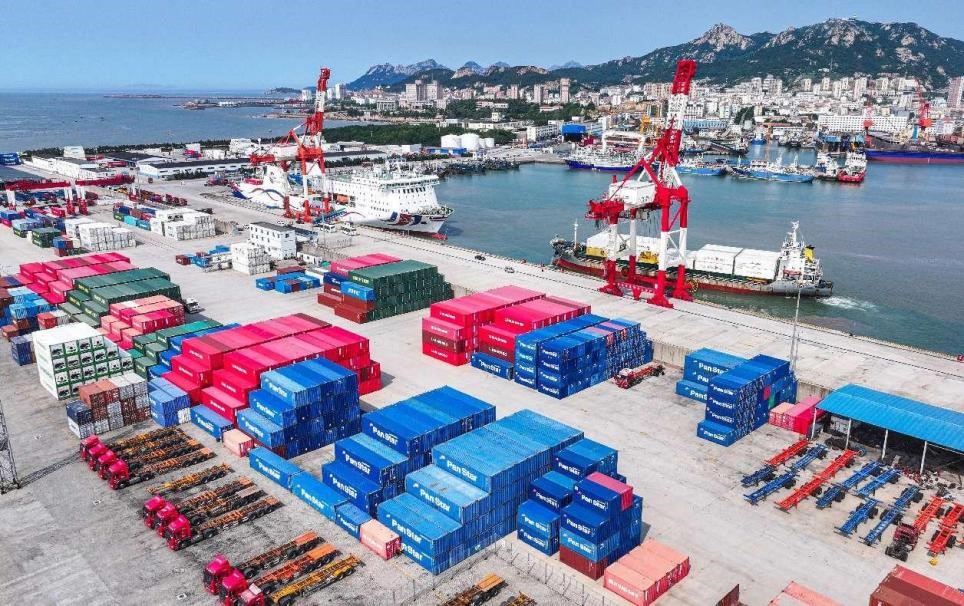 Foreign vessels carrying containers depart from a port in Rongcheng, east China's Shandong province, for their destinations overseas. (People's Daily Online/Li Xinjun)