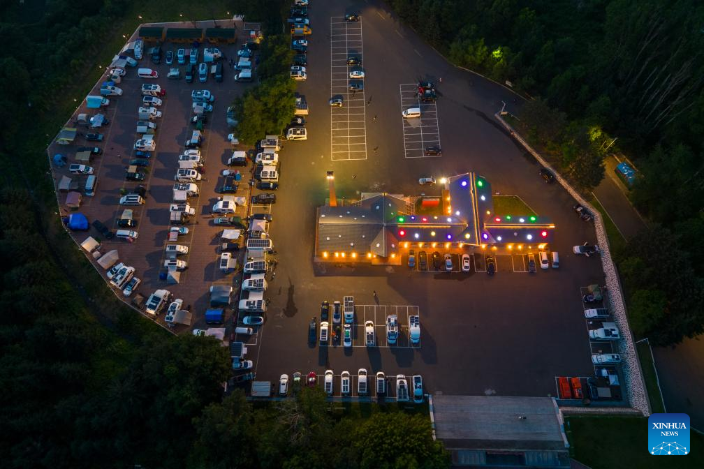 This aerial drone photo taken on July 11, 2024 shows vehicles parking at a RV camp in Xing'an National Forest Park in Yichun, northeast China's Heilongjiang Province. Yichun in northeast China's Heilongjiang Province becomes a popular travel destination in summer. With the city's abundant forest resources, many tourists come here for its fresh air and mild temperature. (Xinhua/Zhang Tao)