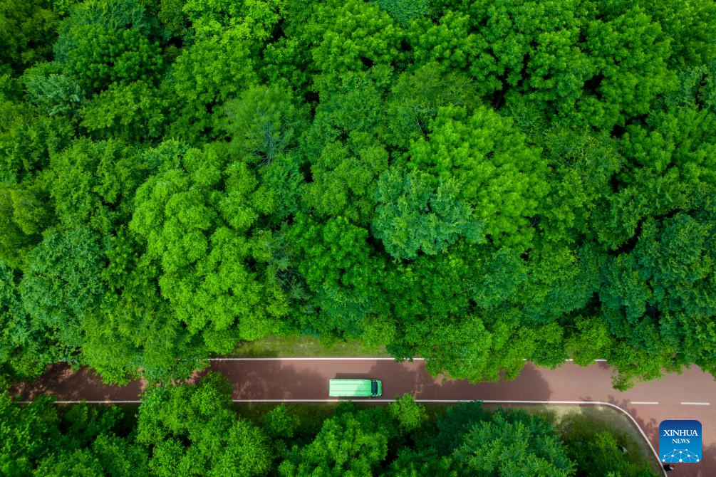 An aerial drone photo taken on July 11, 2024 shows a vehicle running in Shangganling stream forest park in Yichun, northeast China's Heilongjiang Province. Yichun in northeast China's Heilongjiang Province becomes a popular travel destination in summer. With the city's abundant forest resources, many tourists come here for its fresh air and mild temperature. (Xinhua/Zhang Tao)