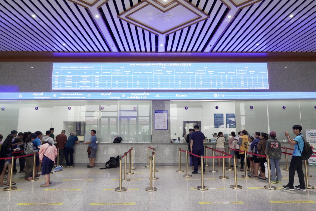 Passengers wait in line to buy tickets for the China-Laos Railway at the ticket hall in Vientiane station on June 25. (JIANG JIAXUAN/CHINA DAILY)