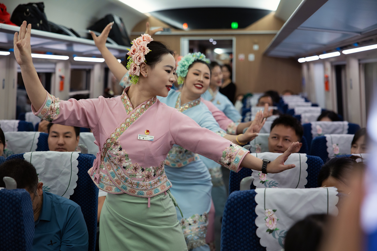 Staff members perform a dance on the inaugural train service from Xishuangbanna, Yunnan province, to Luang Prabang, Laos, on April 13. (CHINA DAILY)