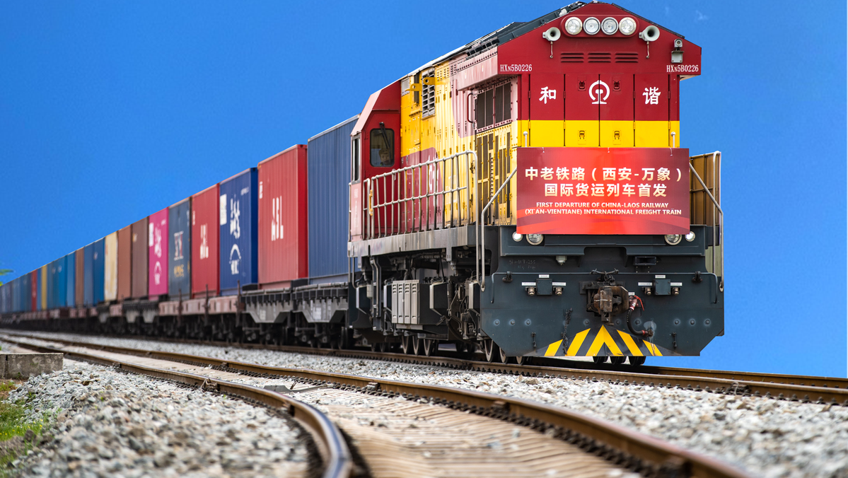 The first freight train heading for the Laotian capital Vientiane departs from the Xi'an international port in Xi'an, Shaanxi province, in April 2022. (LIU XIANG/XINHUA)