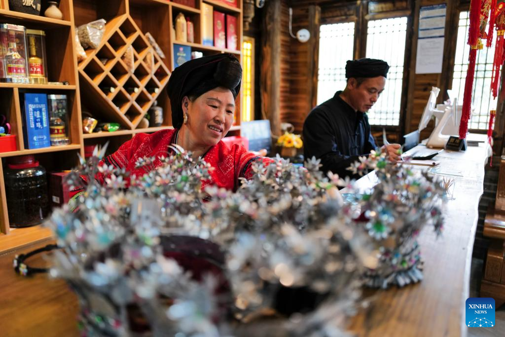 Pan Baofen and her husband work at the homestay they operate at Dazhai Village of Longsheng County, south China's Guangxi Zhuang Autonomous Region, June 26, 2024. (Xinhua/Liu Chan)