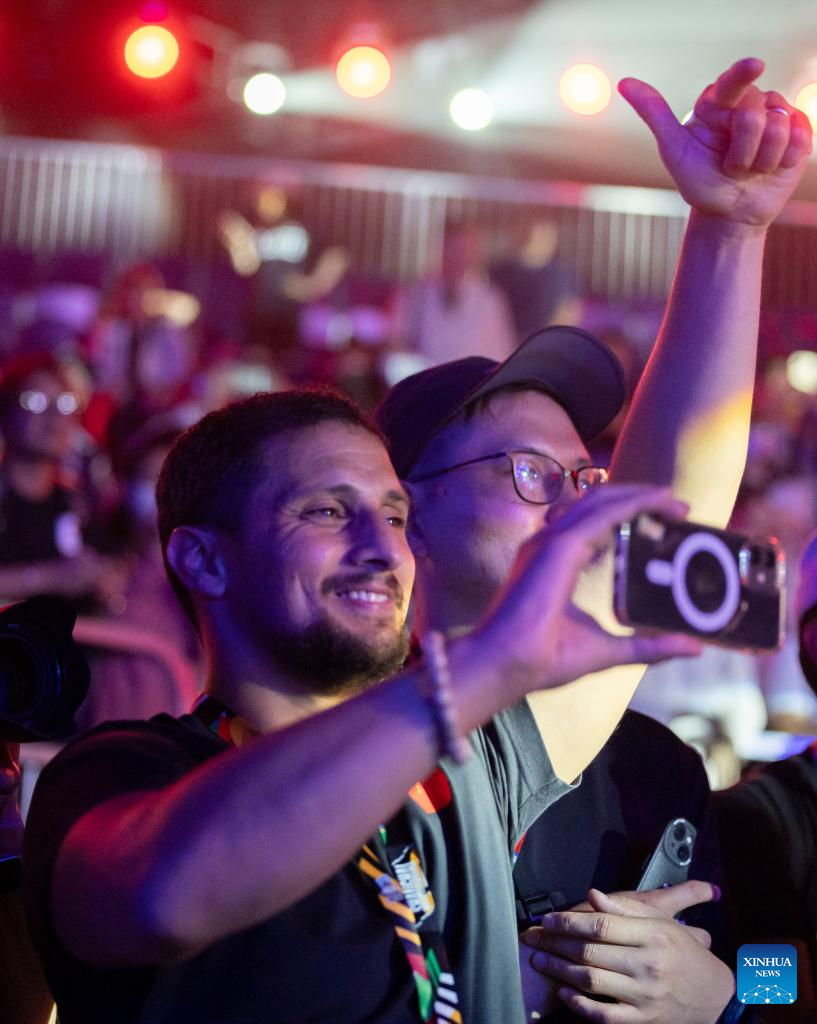 French coach Mounir Biba (R) takes photos as he participates in an event to promote breaking at the Nanjing School for the Deaf in Nanjing, east China's Jiangsu Province, June 6, 2024. (Xinhua/Cao Can)