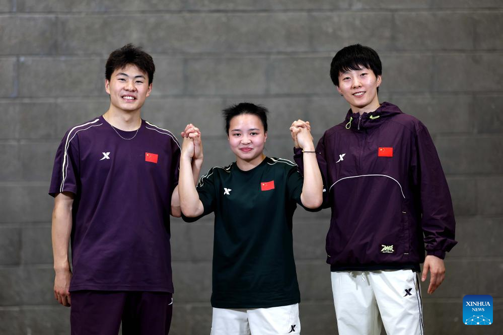 Chinese breakdancers Qi Xiangyu, Liu Qingyi and Zeng Yingying (L to R), who are qualified for the Paris Olympics, pose for photos in Beauvais, France, July 11, 2024. (Xinhua/Cao Can)