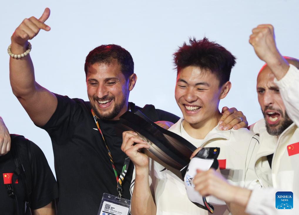 French coach Mounir Biba (1st R) celebrates for Chinese breakdancer Qi Xiangyu (2nd L) after the men's final at the Olympic Qualifier Series in east China's Shanghai, May 19, 2024. (Xinhua/Cao Can)