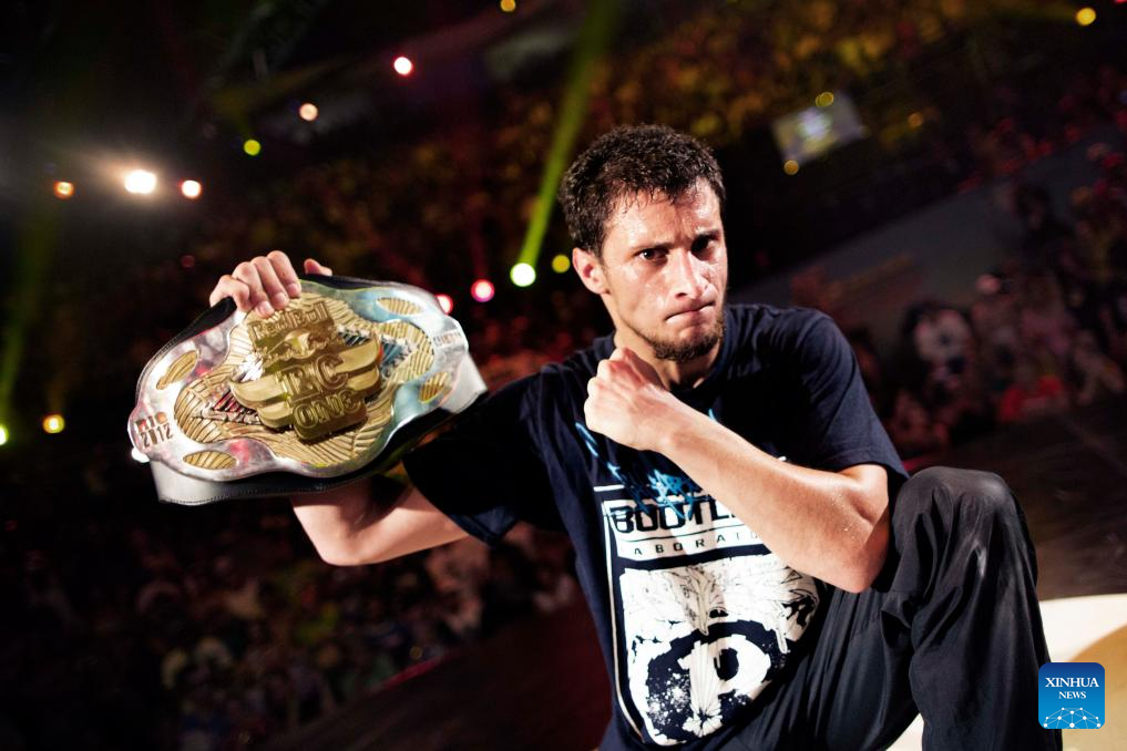 This file photo taken in 2012 shows Mounir Biba posing with the belt after winning the 2012 Red Bull BC One championship. (Xinhua/Cao Can)