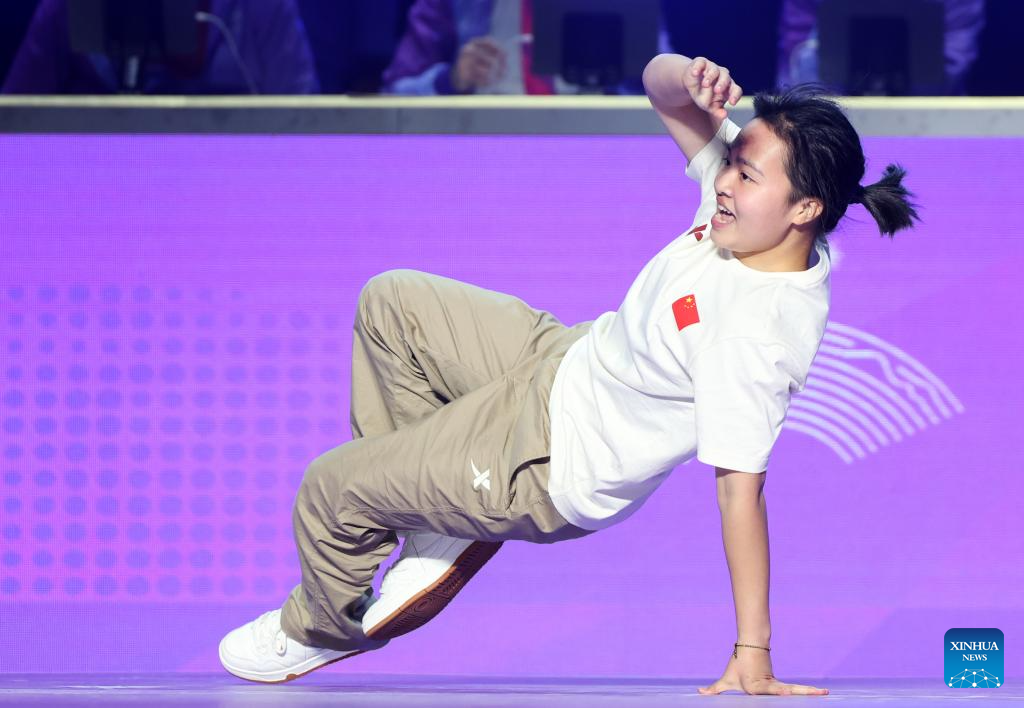 Chinese breakdancer Liu Qingyi competes during the women's gold medal battle of breaking at the 19th Asian Games in Hangzhou, east China's Zhejiang Province, Oct. 7, 2023. With this gold medal, Liu secures her spot in the Paris Olympics in advance. (Xinhua/Cao Can)
