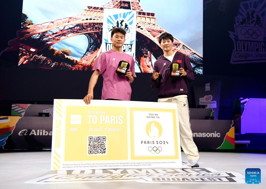 Chinese breakdancer Qi Xiangyu (L) and Zeng Yingying pose for photos at the Olympic Qualifier Series in Budapest, Hungary, June 23, 2024. (Xinhua/Cao Can)