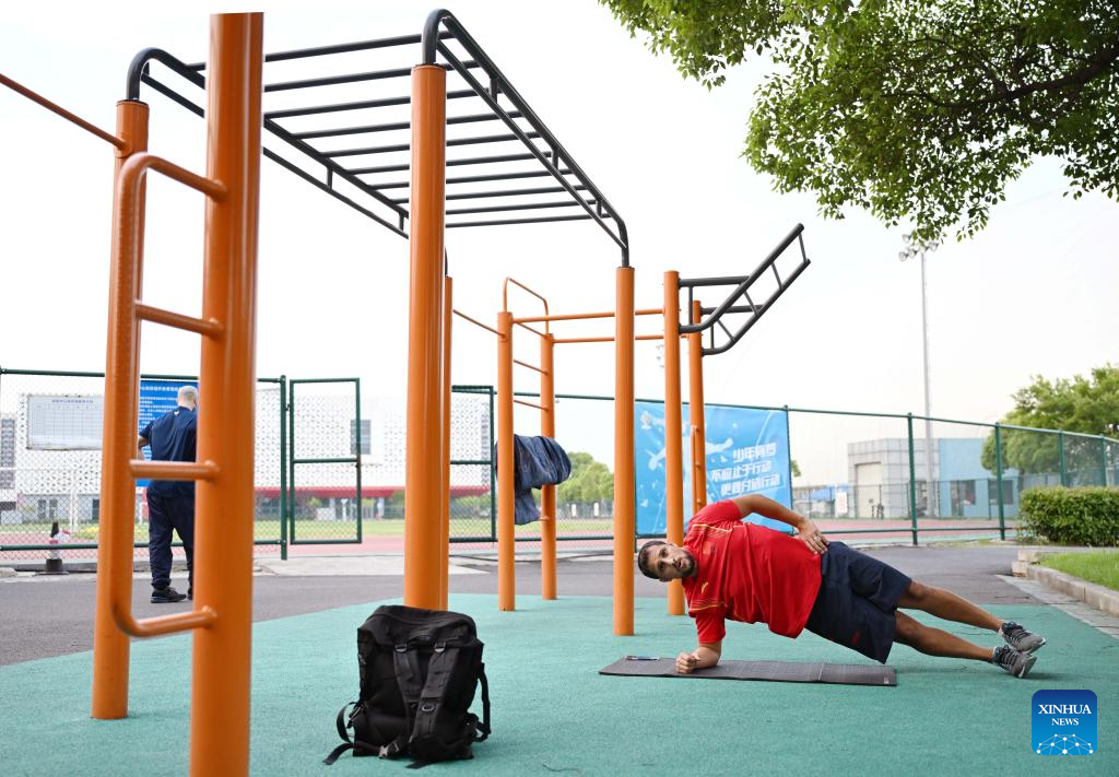French coach Mounir Biba performs side-plank exercises during his workout in Nanjing, east China's Jiangsu Province, May 10, 2024. (Xinhua/Cao Can)