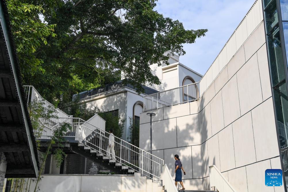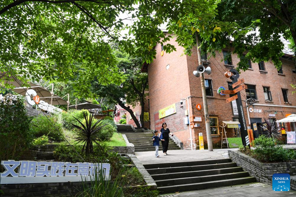 Tourists visit the Yinghua Lane cooperative village - youth international community in Jiangbei District of southwest China's Chongqing, July 15, 2024.?(Xinhua/Wang Quanchao)