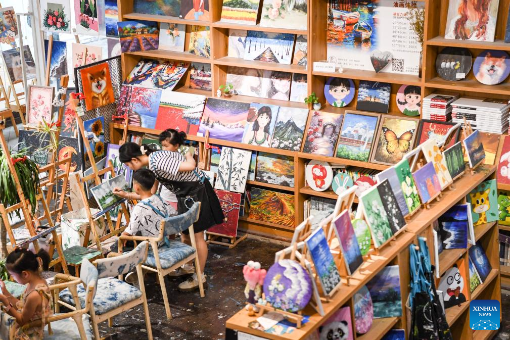Tourists try painting at the Beicang Cultural and Creative Street in Jiangbei District of southwest China's Chongqing, July 15, 2024. (Xinhua/Wang Quanchao)