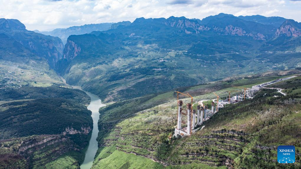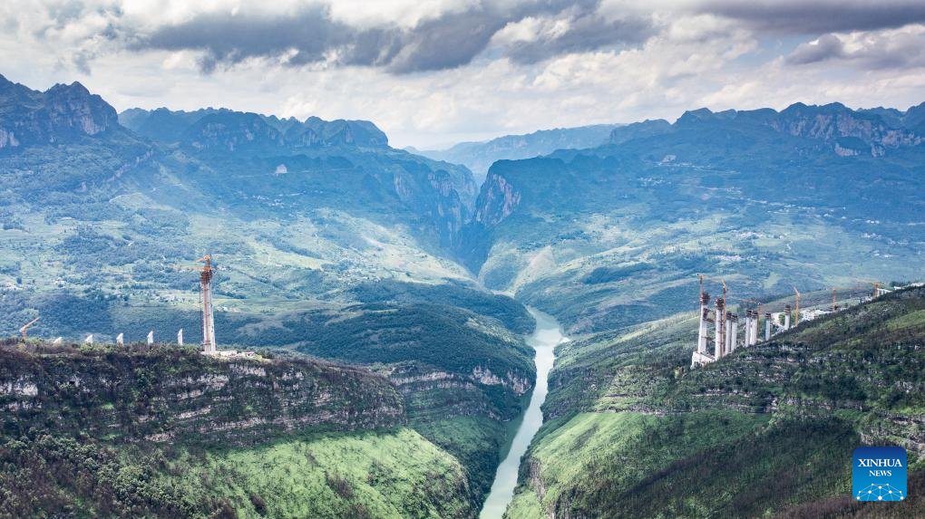 This aerial drone photo taken on July 17, 2024 shows the Tianmen grand bridge in construction in southwest China's Guizhou Province. The 1,553-meter grand bridge is a major project on the expressway linking Anshun and Panzhou in Guizhou. (Xinhua/Tao Liang)