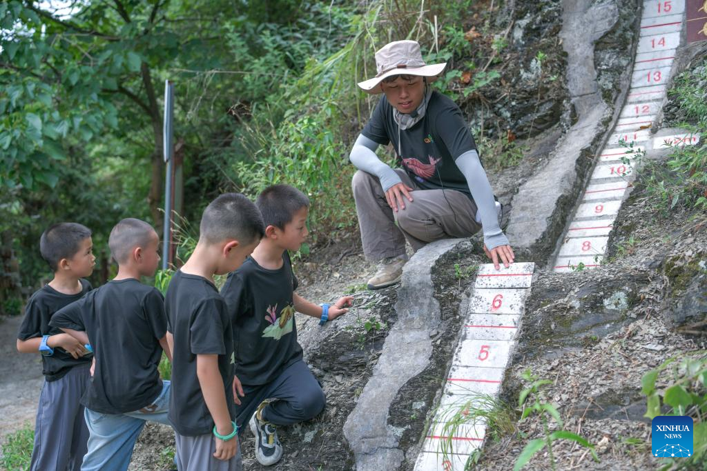Liu Feng's son Liu Xingyu (1st R) explains geological knowledge to children during the summer vacation at the Miaoling National Geopark in Qiandongnan Miao and Dong Autonomous Prefecture, southwest China's Guizhou Province, July 15, 2024. (Xinhua/Yang Wenbin)