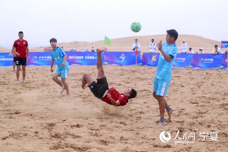 Contestants compete in a desert football match during the desert sports contest at Shapotou scenic spot in Zhongwei city, northwest China's Ningxia Hui Autonomous Region. (People's Daily Online/Yan Mengjie)