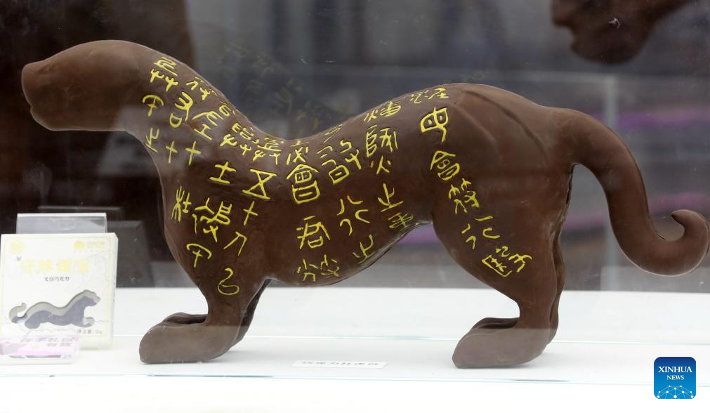 This photo taken on July 18, 2024 shows a chocolate replica of a tiger-shaped figurine at a chocolate museum in the Great Tang All Day Mall in Xi'an, northwest China's Shaanxi Province. The chocolate museum, covering an area of 10,000 square meters, showcases more than 100 chocolate creations themed on Chinese ancient architecture and cultural relics which attract lots of visitors. (Xinhua/Liang Aiping)