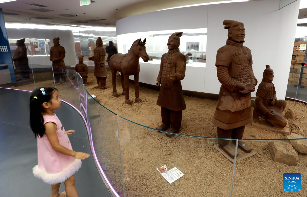 A girl views chocolate replicas of the Terra Cotta Warriors at a chocolate museum in the Great Tang All Day Mall in Xi'an, northwest China's Shaanxi Province, July 18, 2024. The chocolate museum, covering an area of 10,000 square meters, showcases more than 100 chocolate creations themed on Chinese ancient architecture and cultural relics which attract lots of visitors. (Xinhua/Liang Aiping)