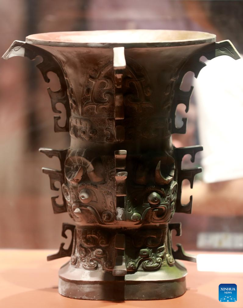 This photo taken on July 18, 2024 shows a chocolate replica of He Zun, a bronze ritual wine vessel, at a chocolate museum in the Great Tang All Day Mall in Xi'an, northwest China's Shaanxi Province. The chocolate museum, covering an area of 10,000 square meters, showcases more than 100 chocolate creations themed on Chinese ancient architecture and cultural relics which attract lots of visitors. (Xinhua/Liang Aiping)