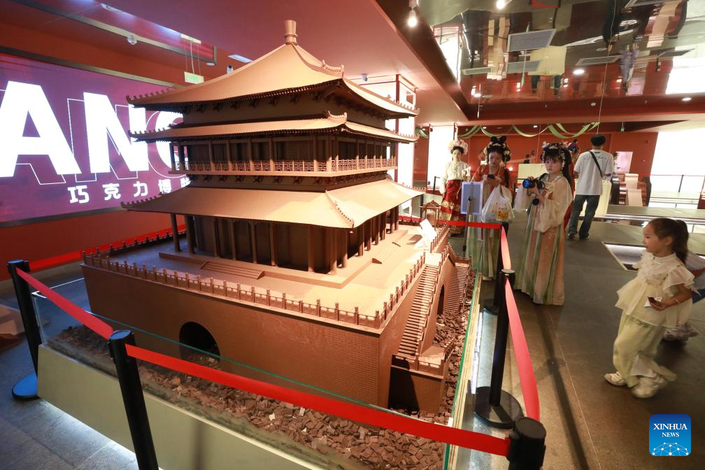 Tourists view a chocolate model of the Bell Tower at a chocolate museum in the Great Tang All Day Mall in Xi'an, northwest China's Shaanxi Province, July 18, 2024. The chocolate museum, covering an area of 10,000 square meters, showcases more than 100 chocolate creations themed on Chinese ancient architecture and cultural relics which attract lots of visitors. (Xinhua/Liang Aiping)