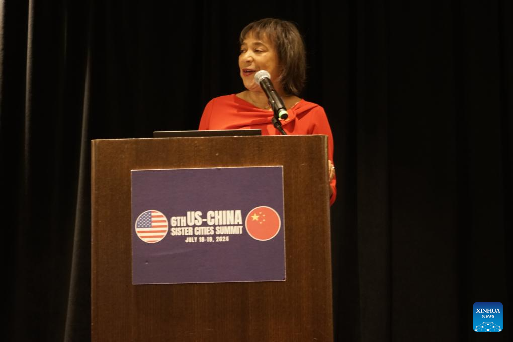 Victoria Woodards, mayor of Tacoma, speaks during the sixth U.S.-China Sister Cities Summit in Tacoma, Washington State, the United States, on July 19, 2024. The sixth U.S.-China Sister Cities Summit was held Friday in Tacoma, a port city in western U.S. state of Washington, aimed at deepening friendship and strengthening sub-national exchanges between the two countries. (Photo by Zeng Hui/Xinhua)