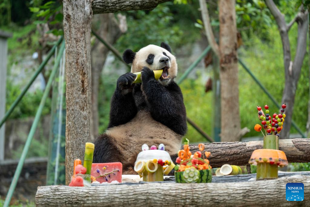 Giant panda Pan Yue enjoys a birthday treat at the Shenshuping giant panda base of Wolong National Nature Reserve in southwest China's Sichuan Province, July 19, 2024. A special event was held to celebrate the birthdays of giant pandas here on Friday. Carrots, watermelons and other food were prepared for them as the birthday treat. (Xinhua/Yu Li)