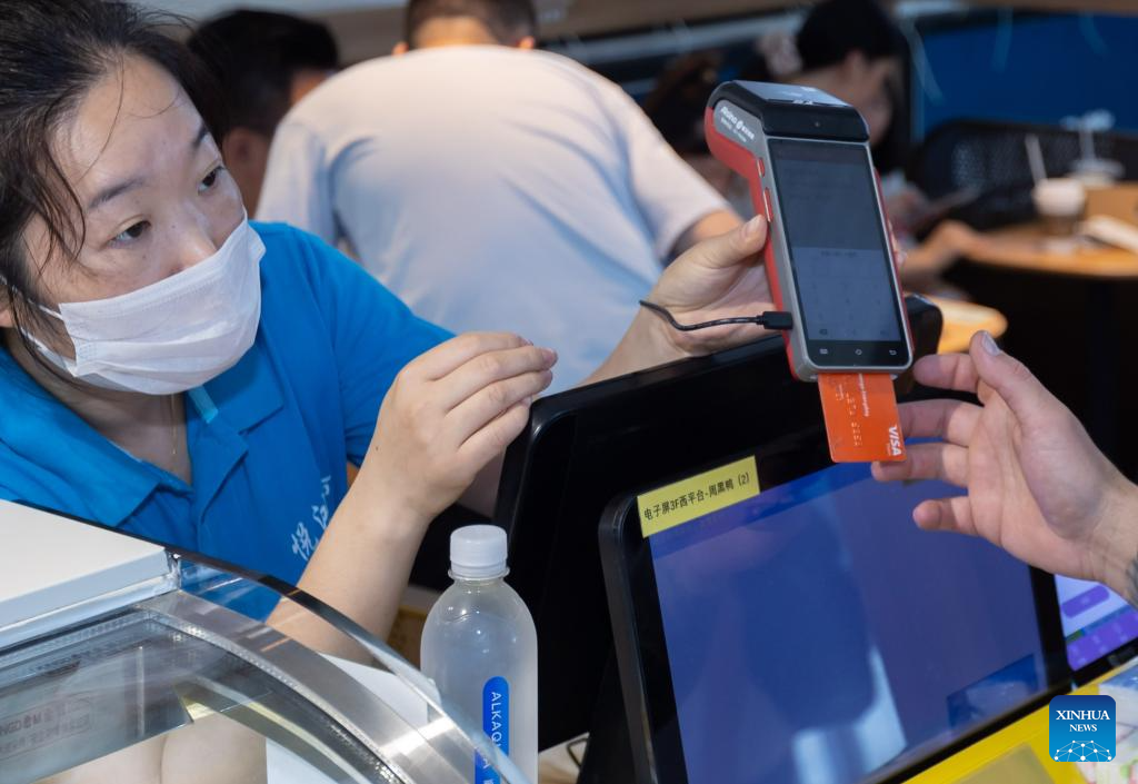 An Australian traveler pays for a bottle of water with a Visa card at a store at Hongqiao Railway Station in Shanghai, east China, July 19, 2024. To cater to the growing international travelers influx, Shanghai Hongqiao Railway Station and retailers now allow international travelers to use cards issued by international bank card organizations including Visa, Mastercard and etc. (Photo by Yu Jiayi/Xinhua)