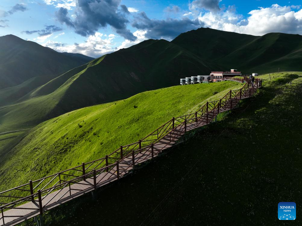 Tourists enjoy the scenery at a bend along the Yellow River in Mentang Township of Jiuzhi County, Golog Tibetan Autonomous Prefecture, northwest China's Qinghai Province, July 19, 2024. (Xinhua/Zhang Long)