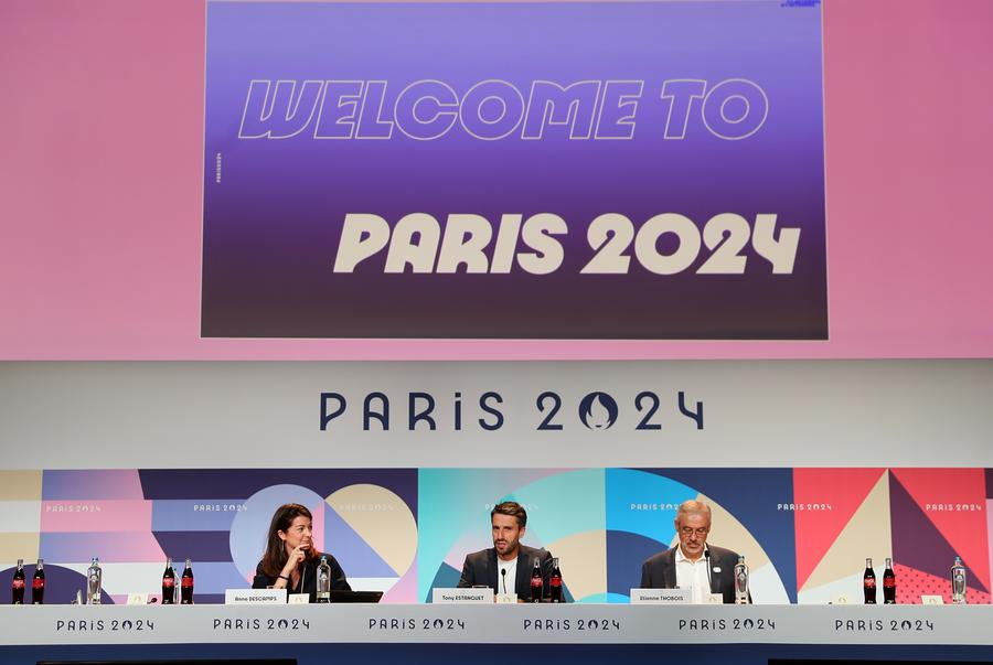 Tony Estanguet (C), President of Paris 2024, speaks during a press conference at Paris 2024 Main Press Centre in Paris, France, July 21, 2024. (Xinhua/Wang Dongzhen)